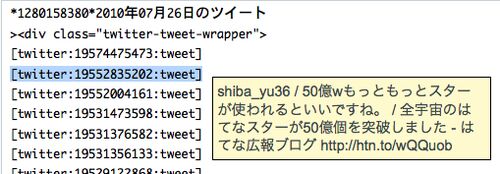 twitterのつぶやきをはてなダイアリーでまとめているときに、どの記法がどのつぶやきかわからなくなることがあると思います。一応プレビューを見ればわかると言えばわかりますが、非常に面倒です。なので記法をドラッグするだけでtipsのような形で内容を表示…