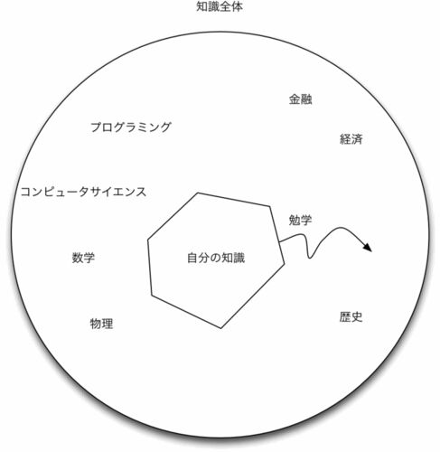どこで聞いたか忘れたけれど、以前「知識っていうのは円のようなものだ」って聞いたことがあった。今日はふとそうだなと思ったのでブログに書く。 知識の図 適当に知識ってこんな感じだよなーっていうのを図にしてみた。超適当だけれど。 一番大きい枠は知識…